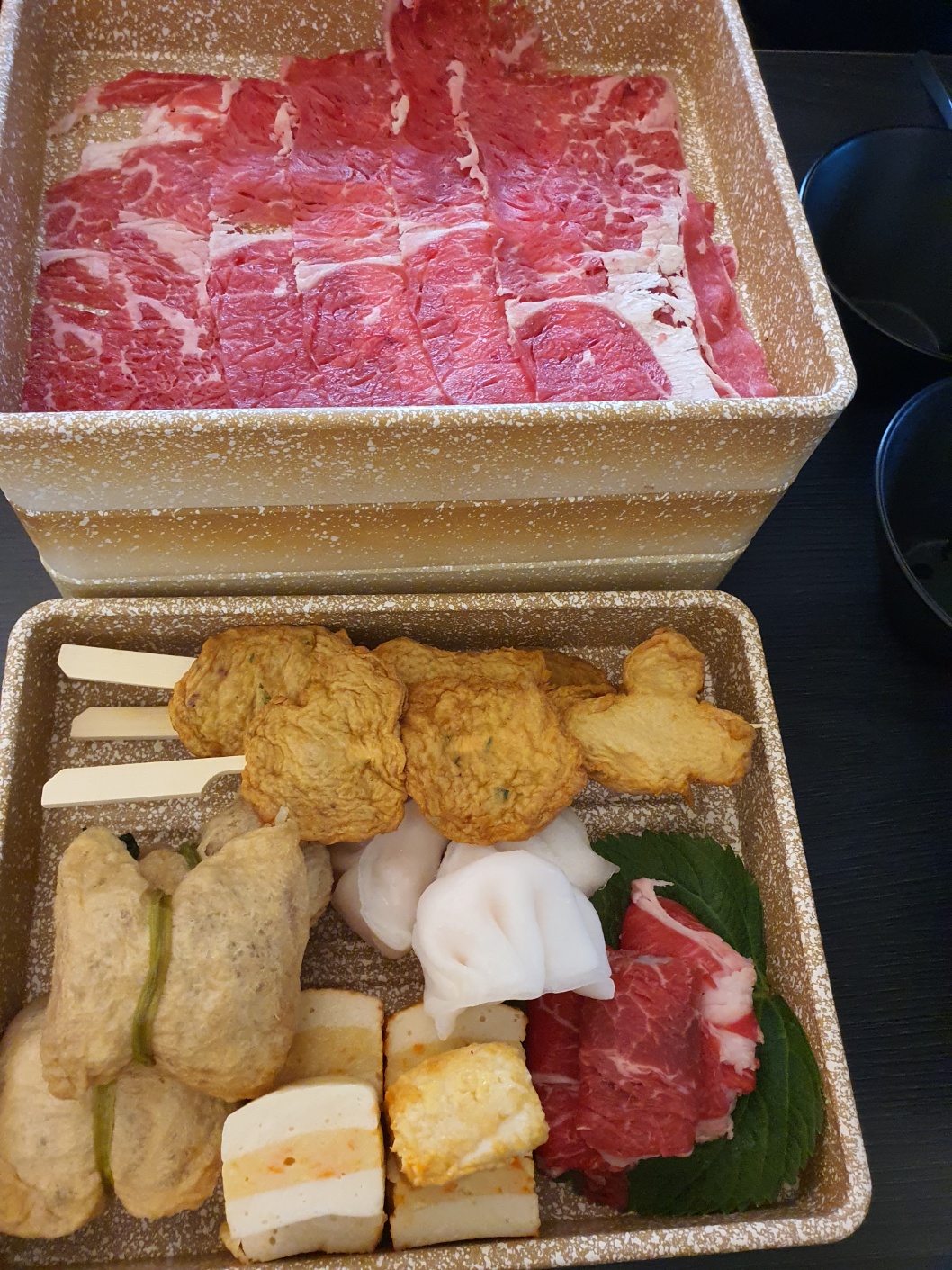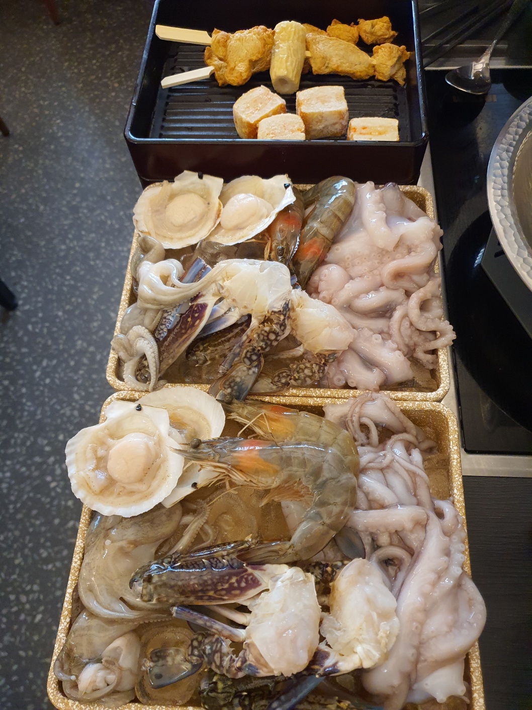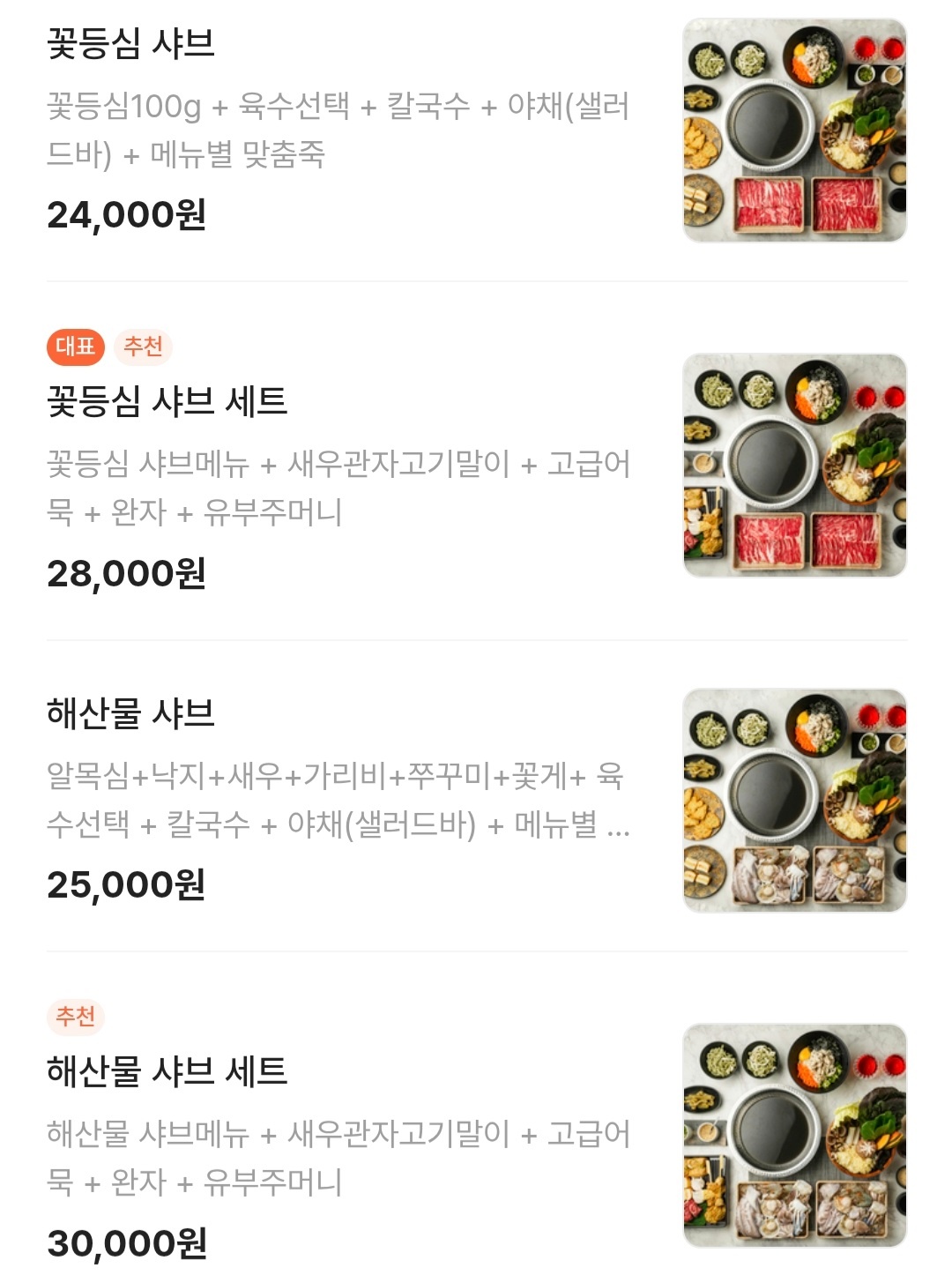 저희는 흑마늘 육수에 알목심 샤브 세트 3인과 꽃게해물 육수에 해산물 샤브 2인 주문했습니다.