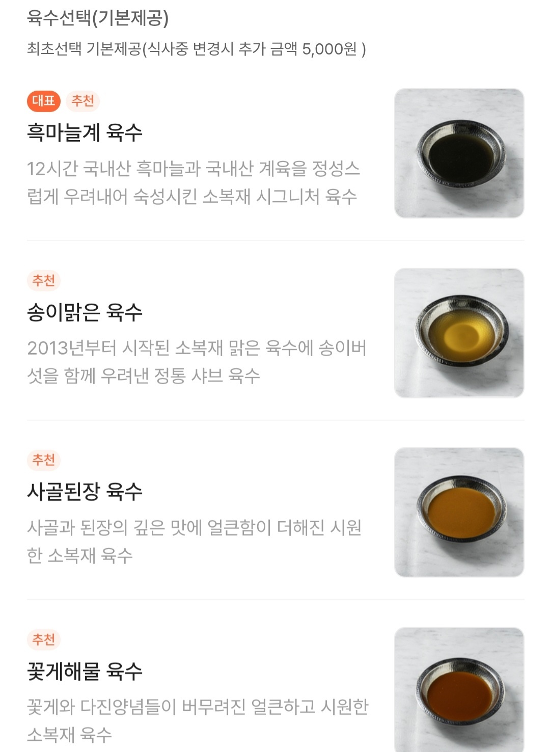 소복재는 흑마늘 육수 외에도 4가지 육수를 선택할 수 있어 개인 취향에 맞는 샤브샤브를 즐길 수 있습니다.