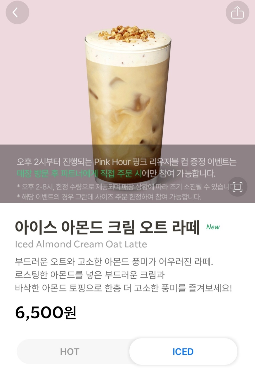 저는 스타벅스 아이스 아몬드 크림 오트 라떼를 선택! 💖 오늘 날씨가 비교적 따뜻해서 아이스로 골랐습니다.
